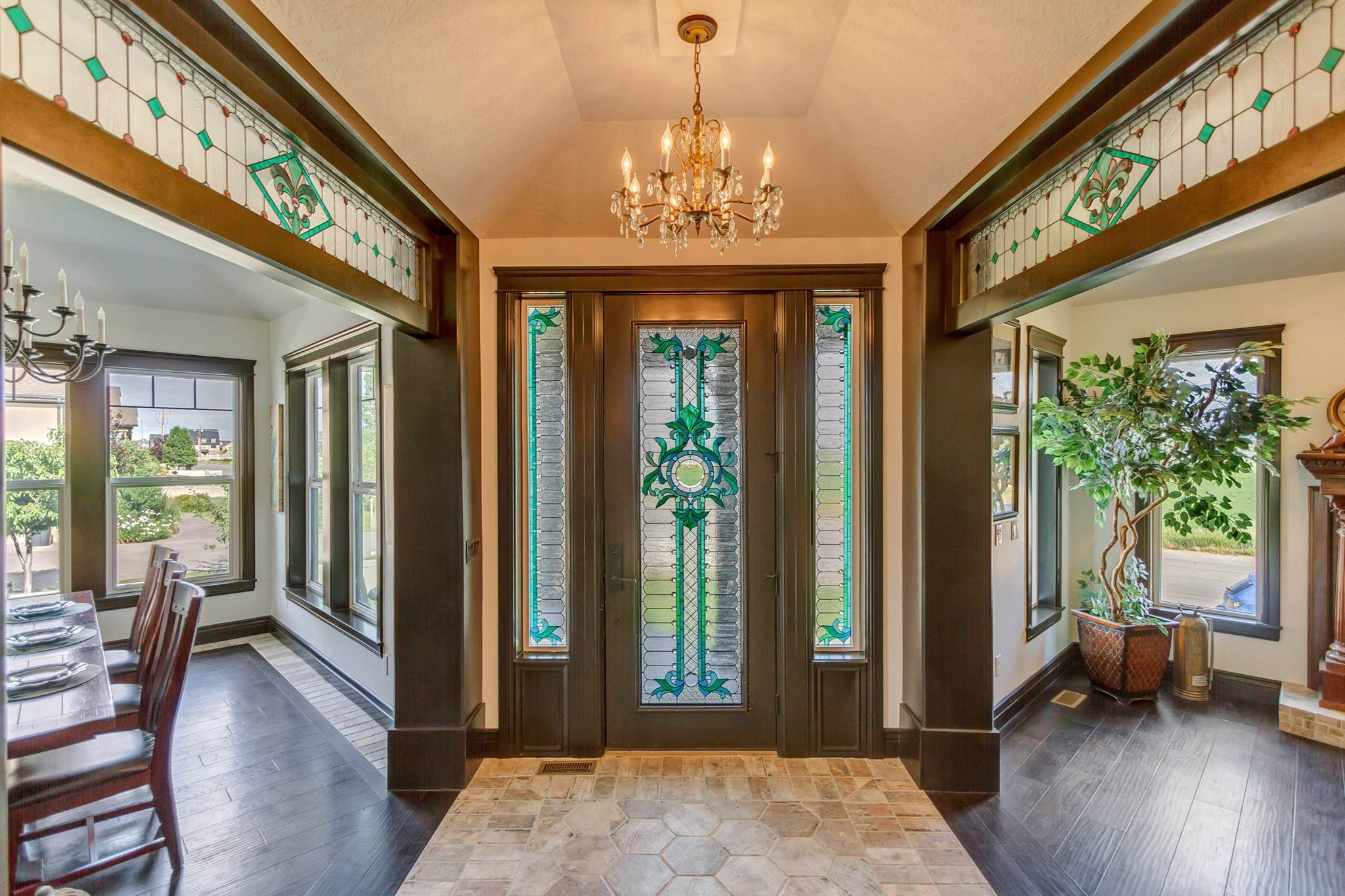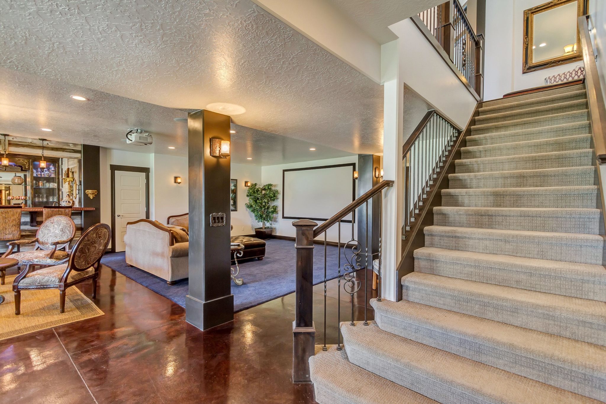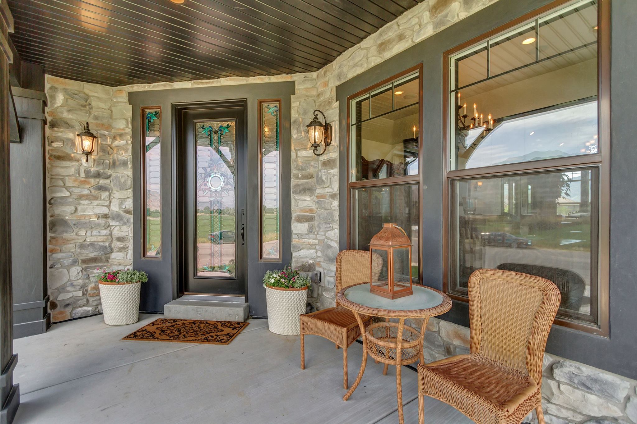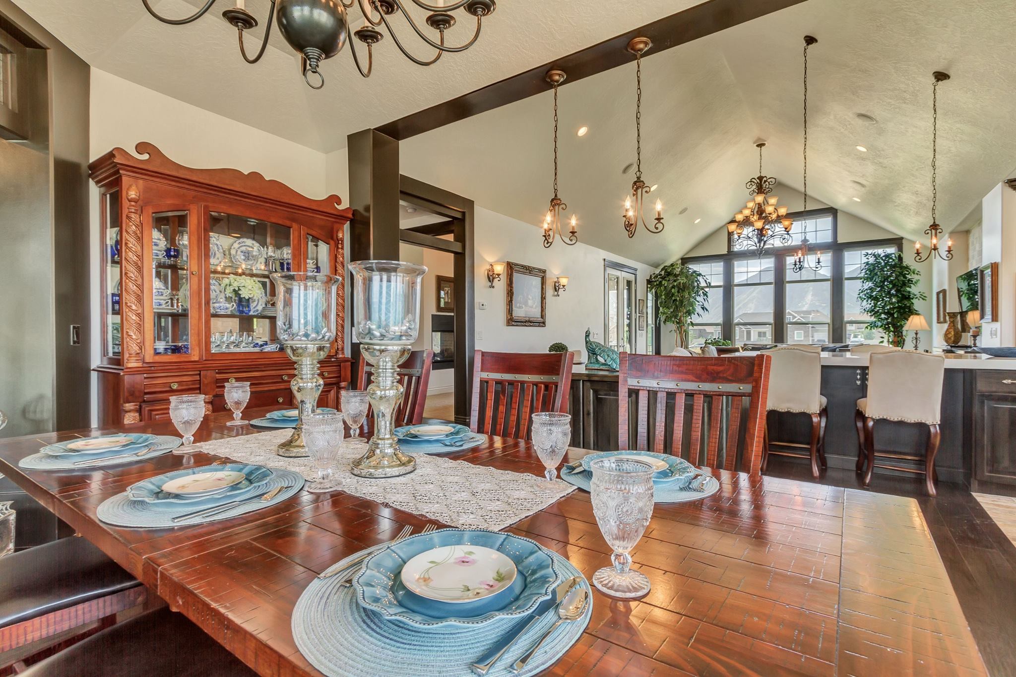 Spanning 5,384 square feet, this magnificent custom home is bathed in light, has soaring vaulted ceilings, and offers great mountain views from multiple vantage points. The large entry is surrounded by stained glass and flanked on one side with a beautiful hearth room including a massive hand-carved fireplace mantel and on the other by an elegant formal dining room, both with tray ceilings.