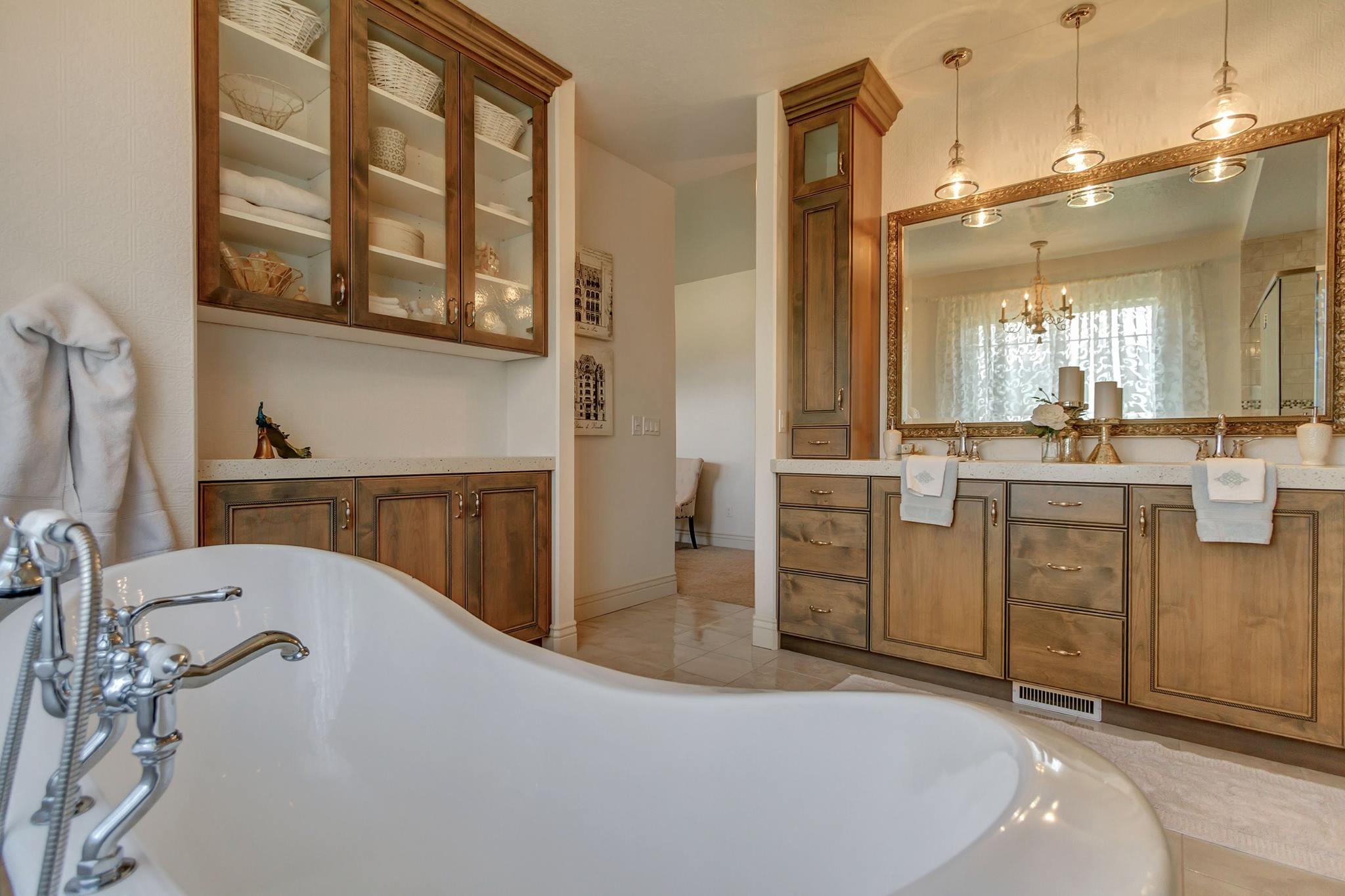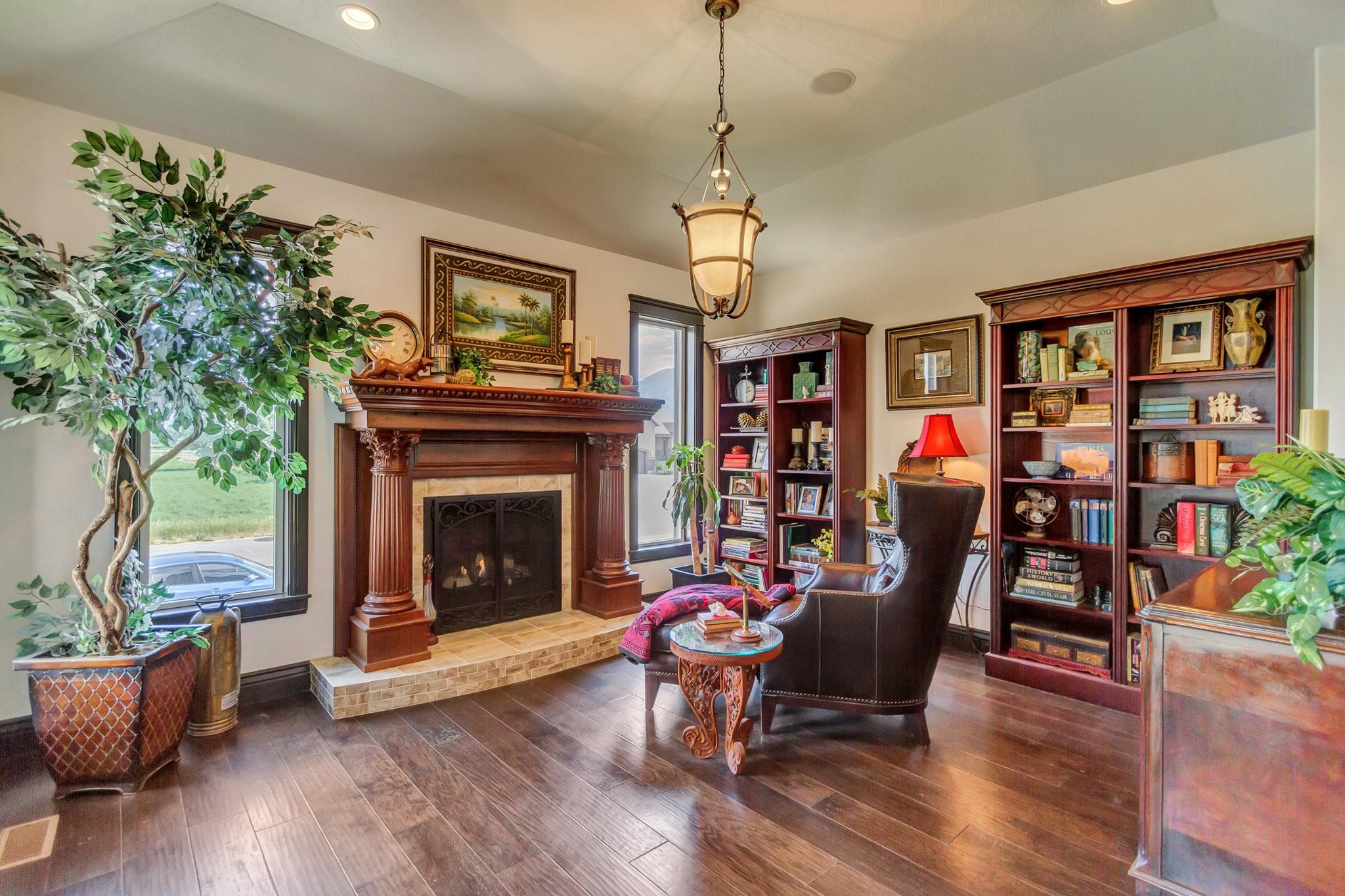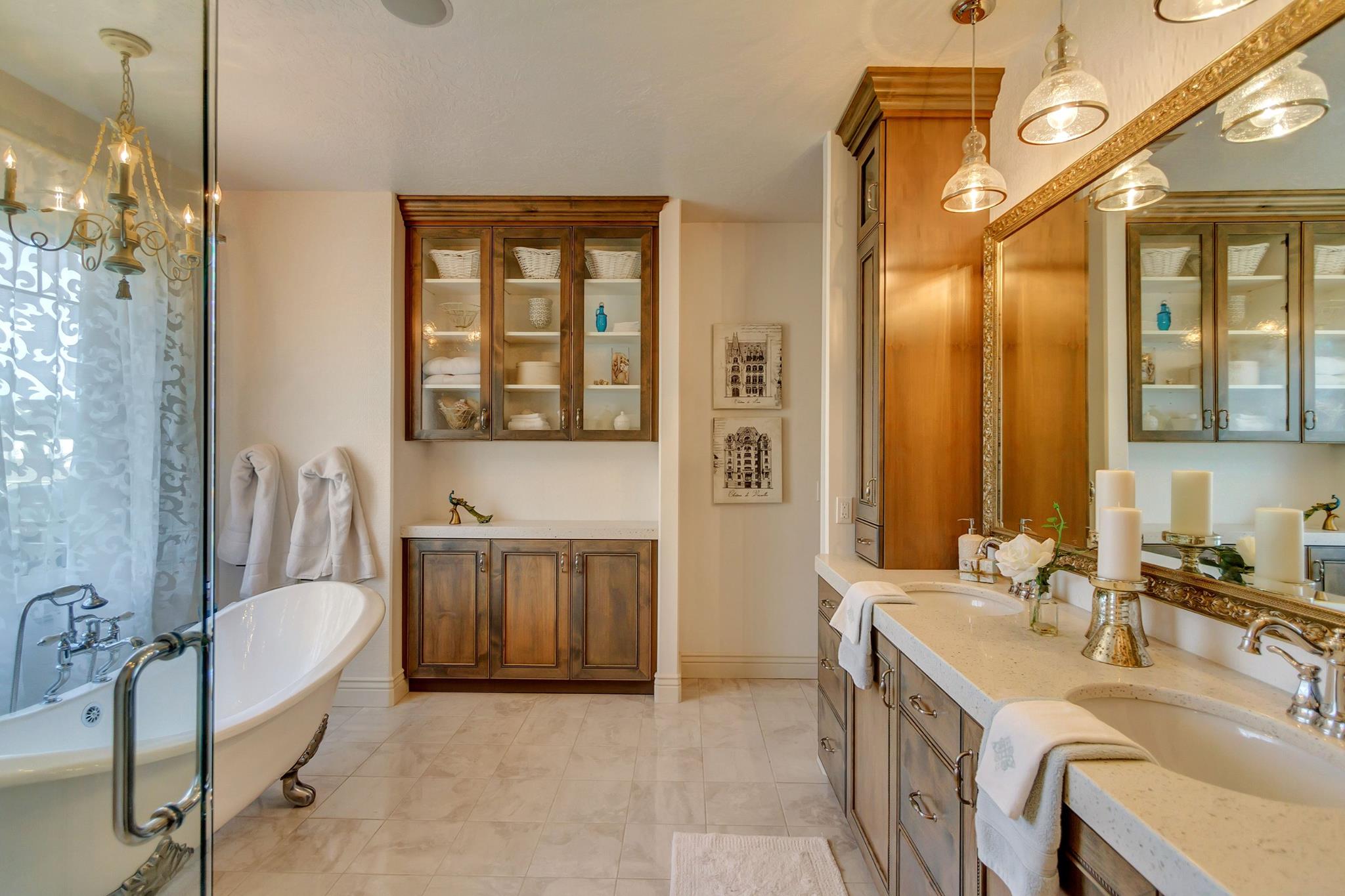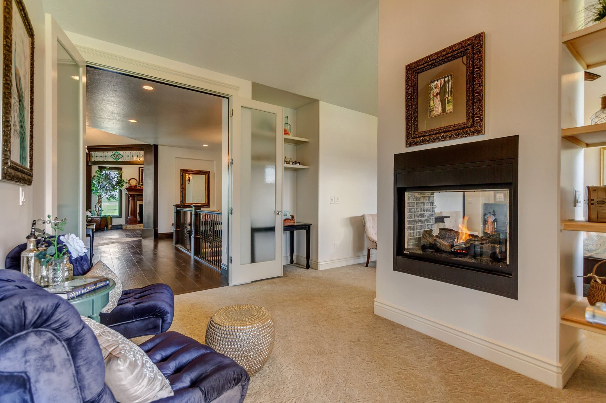 Spanning 5,384 square feet, this magnificent custom home is bathed in light, has soaring vaulted ceilings, and offers great mountain views from multiple vantage points. The large entry is surrounded by stained glass and flanked on one side with a beautiful hearth room including a massive hand-carved fireplace mantel and on the other by an elegant formal dining room, both with tray ceilings.